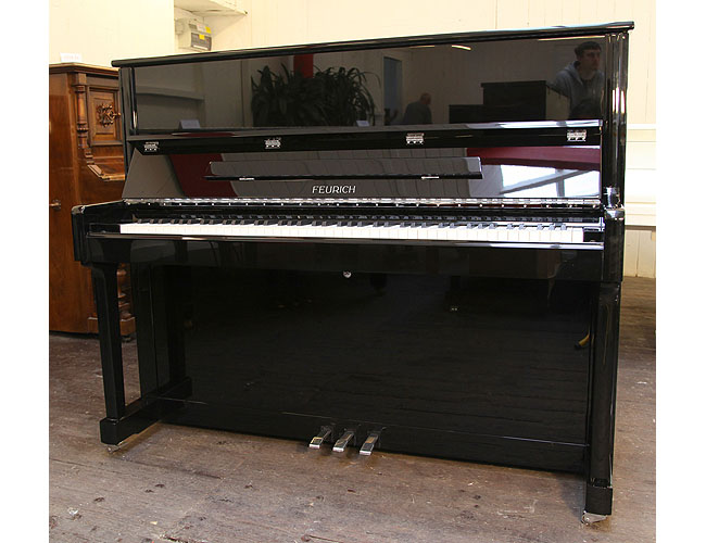 Brand new, Feurich Model 122 upright piano with a black case and chrome fittings